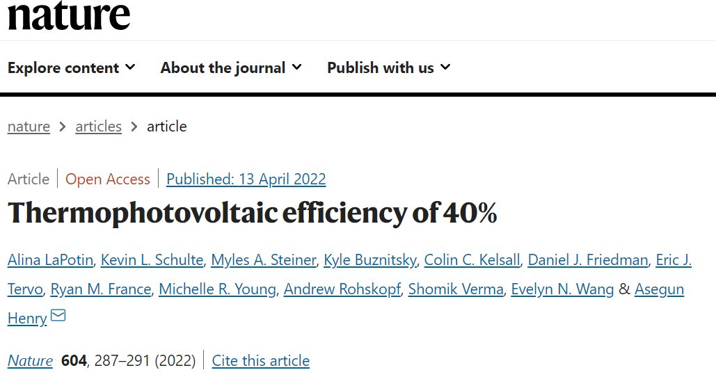 LaPotin, A., Schulte, K.L., Steiner, M.A. et al. Thermophotovoltaic efficiency of 40%. Nature 604, 287–291 (2022).