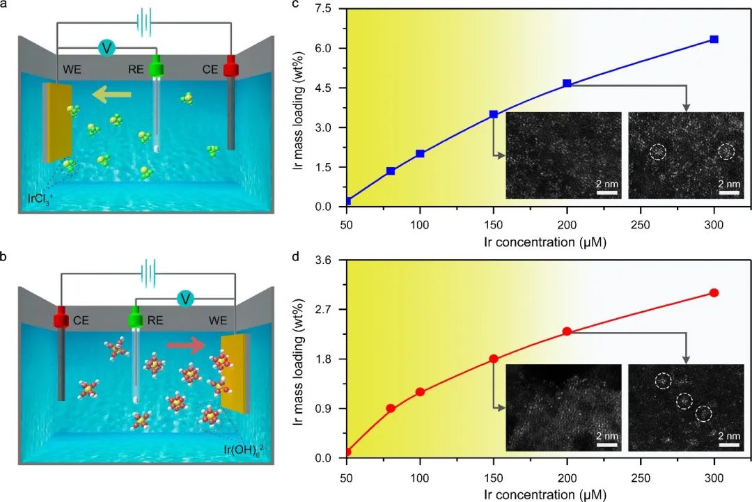 近年来,单原子催化剂因为具有最大化的原子利用率和独特的电子结构,在水解、氧还原、二氧化碳加氢、甲烷转化等化学反应中受到了广泛关注。但是,目前合成单原子催化剂的方法对单原子和衬底都有比较高的要求,还不能实现在任何衬底上制备任何的金属单原子催化剂,因此,发展对衬底和金属无选择性的普适性单原子合成方法具有重要意义。研究人员在电化学三电极体系下进行电化学沉积,并通过阴极沉积和阳极沉积获得了两种Ir1/Co(OH)2单原子催化剂。通过X射线吸收精细结构谱发现,阴极和阳极沉积获得的两种Ir单原子具有不同的价态和配位环境。进一步的研究表明,这一差异是由于阴极、阳极沉积过程中不同的沉积物种以及阴、阳极上发生的不同氧化还原反应造成的。此外,研究人员又探究了沉积条件(前驱体浓度、沉积圈数和沉积速率)对单原子形成的影响,发现当金属的负载量低于某一限度时,可以获得单原子;高于这一限度时则有金属团簇或颗粒形成,这一变化类似于液相中晶体生长中的成核过程(图1)。为了证明该方法的普适性,研究人员又在氢氧化钴、硫化钼、氧化锰、氮掺杂的碳等衬底上成功获得覆盖3d、4d、5d金属的单原子催化剂,并且对所制备的单原子催化剂的结构表征后发现,阴极和阳极沉积获得的同一单原子催化剂具有不同的电子结构,这为其在不同催化反应中的应用提供了可能。图1.电化学沉积制备单原子的机理研究。(a)阴极沉积示意图;(b)阳极沉积示意图;(c)在阴极沉积中,前驱体浓度、沉积量和单原子形成的关系;(d)在阳极沉积中,前驱体浓度、沉积量和单原子形成的关系。研究人员还对所得单原子催化剂在电催化水分解反应中的性能进行了探究。实验结果表明,阴极沉积所得的一些催化剂在电催化析氢反应中表现出了优异的性能,尤其是负载在硒化钴铁衬底上的铱单原子催化剂仅需8 mV的过电势即可获得10 mA/cm2的电流密度。同时,阳极沉积所得的一些催化剂在电催化析氧反应中也表现出了良好的性能。研究人员进一步通过阴极和阳极沉积将铱单原子沉积在生长到泡沫镍上的硒化钴铁衬底上,并分别作为电催化全水解反应的阴极和阳极。电化学测试表明,该系统仅需1.39 V的电势即可获得10 mA/cm2的全水解电流密度,突破了在碱性电解质中的最低电势记录。 该制备单原子催化剂的普适性方法不仅为单原子催化领域注入了新的活力,而且为今后系统性研究催化剂结构和性能之间的关系提供了新的思路。该项研究得到了国家杰出青年科学基金、国家重点研发计划、中科院前沿科学重点研究项目、安徽省联合基金重点项目等项目的支持。论文链接:https://www.nature.com/articles/s41467-020-14917-6.pdf