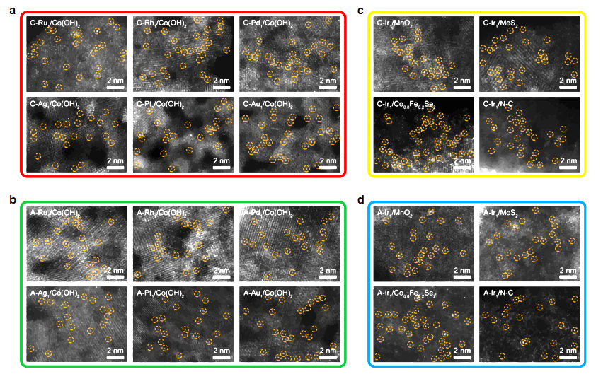HAADF-STEM图像表明,在类似的沉积条件下,通过电化学阴极和阳极沉积能将所有这些金属物种成功地沉积到Co(OH)2纳米片上,并且沉积的金属原子都以单分散形式存在。