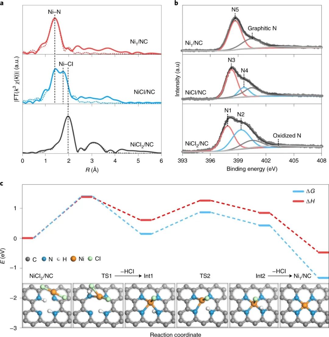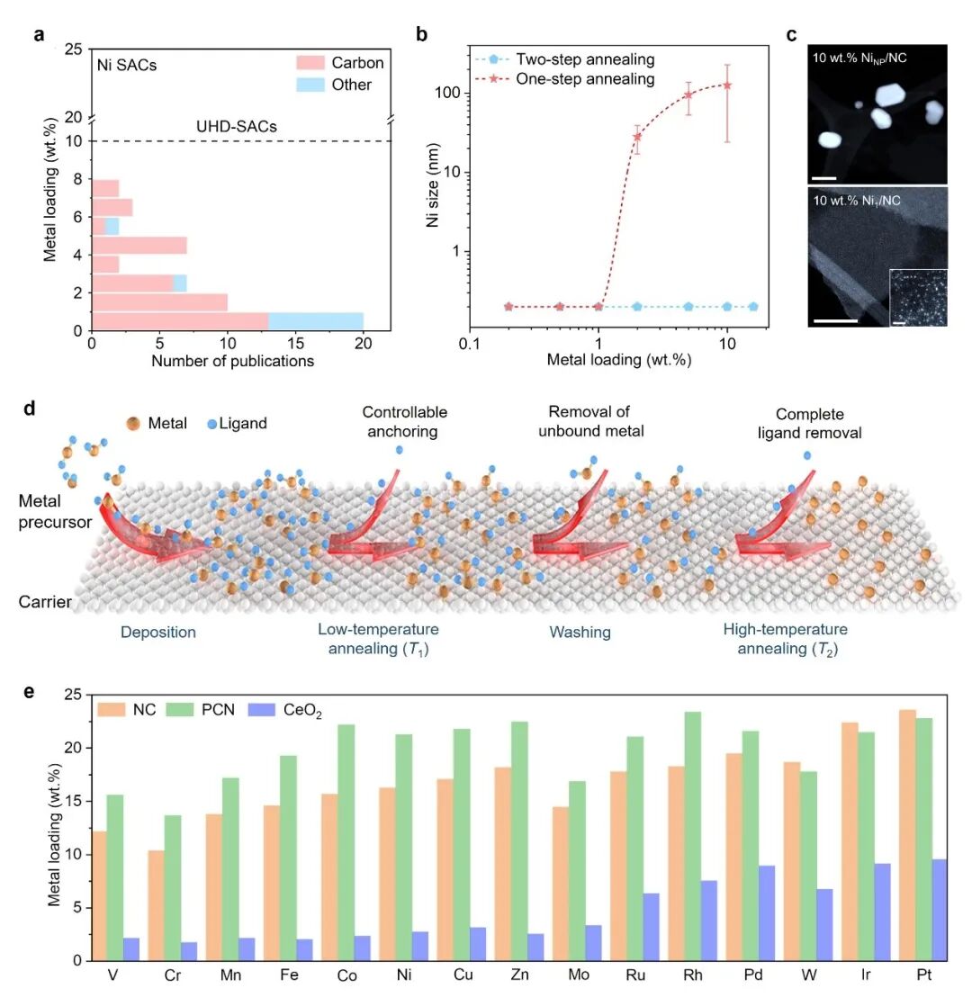 自 2011 年提出单原子催化概念以来,将单分散原子金属中心与可调制的配位环境相结合在全球范围内引起了广泛的研究兴趣,被广泛应用于传统热催化、电催化、光催化、有机催化等众多催化领域。下一个十年我们将见证单原子催化迈向工业化应用的新时代。为了满足大规模反应体系的需求,将孤立的过渡金属稳定在适当的载体表面以形成具有高表面密度的活性中心,最大限度地发挥单原子多相催化剂的工业潜力至关重要。然而,在金属含量超过2 wt%时实现单原子分散仍然具有挑战性,目前仍缺乏大规模可控制备高表面金属密度的单原子催化剂的普适方法,成为单原子催化工业化之路的主要障碍之一。近日,新加坡国立大学吕炯教授、苏黎世联邦理工学院Javier Pérez-Ramírez教授、清华大学李隽教授、南洋理工大学赵晓续团队开发了一种通用的基于简易的湿化学法的两步退火策略,用于大规模合成超高密度单原子催化剂 (UHD-SAC)库。该方法首先通过选择性锚定并控制配体从金属前体中的去除以及与载体的相互作用从而获得高的金属覆盖率,该机制可最大限度地将金属前驱体结合到载体表面的锚定位点。实验中使用常见的金属前驱体(氯化物、硫酸盐或醋酸盐)或其混合物的水/醇溶液。为了金属前驱体的锚定及配体的可控去除,第一步退火(T1)的温度需要低于金属前驱体的分解温度。随后,通过在较高温度 (T2) 下进行的第二次退火,将化学吸附的金属前体去除剩余的配体以转化为具有明确原子结构的 UHD-SAC。在分子水平上,通过控制实验和计算模拟合成机理表明,该方法依赖于控制配体从金属前驱体的去除以及与载体的相互作用,即通过逐步去除配体、控制金属前驱体与载体的键合,可以防止其热诱导聚集成纳米颗粒。这种普适的 UHD-SAC 合成路线适用于超过15 种常见过渡金属及不同化学性质的载体如氮掺杂的碳、聚合氮化碳、二氧化铈、氧化铝和二氧化钛。进一步地,该方法被成功的应用于自动化模式制备。鉴于金属、载体和化学计量的几乎无限的组合,使用自动化模式制备的可行性能够重复制备明确结构的 UHD-SAC,对于探索更精确的合成-结构-性能关系来指导催化剂的设计非常有吸引力。除了自动化模式制备之外,由于两步退火方法采用简单的操作工艺(浸渍、热处理、洗涤和过滤),很容易扩展到千克级别规模的制备。其所得产物的可重复性、性能并无多大差异,证明了本文所提出的方法具有可控高效性。对于三种不同体系的催化反应研究表明,随着金属含量的增加,整体反应活性都大大增强。此外,这三个催化系统中观察到的不同的单位点活性和负载量的变化关系,也反映了多相催化剂设计时存在的众所周知的复杂性,而现在可以用具有广泛可调金属负载的单原子催化剂库来解决这一问题。综上所述,本文建立了可扩展的湿化学方法,在化学性质不同的载体上来负载广泛的过渡金属,从而制备UHD-SAC库,这是对其实际应用的新突破。实验和理论分析表明,两步退火方法在稳定孤立金属原子、实现高表面密度方面的成功源于金属前驱体与载体的选择性结合。这种受控制的相互作用使弱相互作用的物种得以去除,从而避免了上述物种会在完全分解后发生聚集。除了单金属体系外,还可以很容易地扩展到多金属体系库,证明了两步退火方法的普遍适用性。自动化和大规模合成的可重复性,证明了该方法的可控高效性,为UHD-SAC在可持续化学和能源转化中的广泛应用铺平了道路。图5:两步退火法制备高负载量单原子催化剂的机理分析