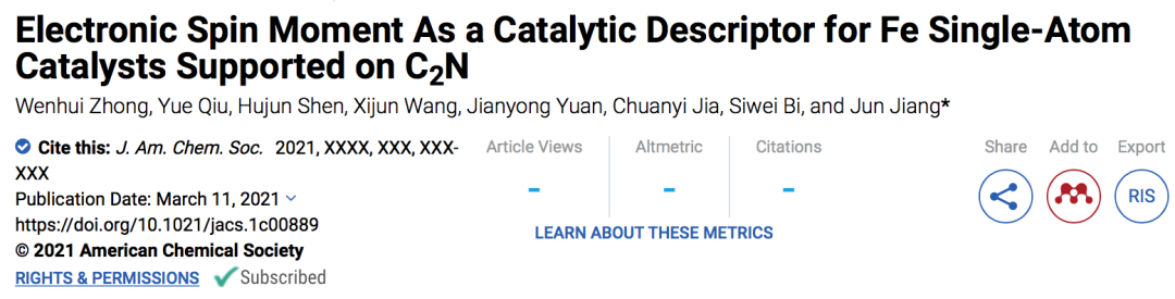 Wenhui Zhong et al. Electronic Spin Moment As a Catalytic Descriptor for Fe Single-Atom Catalysts Supported on C2N. J. Am. Chem. Soc., 2021.