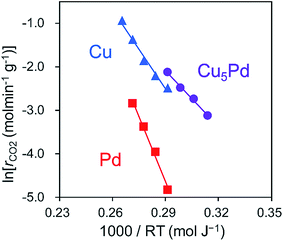 图3. Cu5Pd/Al2O3、Cu/Al2O3、Pd/Al2O3催化剂催化NO + CO反应。