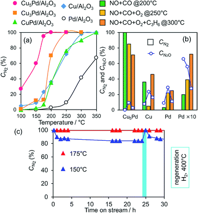 要点2. 与Pd /氧化铝相比,Cu5Pd/氧化铝在催化CO还原NO的反应中,表现出优异的催化活性和N2选择性,在175°C的条件下,第一次实现了NO到N2的全部转变,长期稳定性至少为30 h,该研究是首次在200℃以下将NOx完全除去。