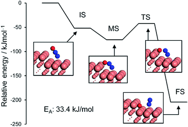 图4. N2O(初始(IS)至中间(MS)态的能量图及其随后分解为N2和O (MS)至最终状态(FS)的能量图。