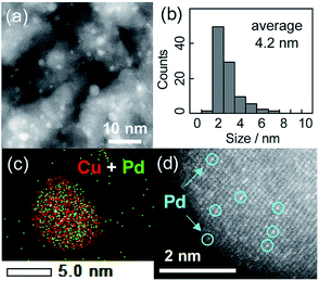 图1.(a) Cu5Pd/Al2O3的HAADF-STEM图像;(b)纳米颗粒的尺寸分布;(c) EDS获得的Pd + Cu覆盖层元素图;(d)单个纳米颗粒的高分辨率图像。