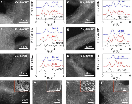 接着采用同步辐射表征技术进一步研究了Ni单原子的电子结构和配位环境。通过X射线吸收近边吸收谱(XANES)和扩展边X射线吸收谱(EXAFS)表征,我们发现碳纳米管中负载的Ni单原子以Ni-N5形式存在,没有Ni-Ni键存在,证实了单原子Ni的形成(图2)。▲Figure 3. HAADF-STEM and EXAFS spectra for (a,b) Cr1-N/CNT, (c,d) Mn1-N/CNT, (e,f) Fe1-N/CNT, (g,h) Co1-N/CNT, (i,j) Cu1-N/CNT and (k,l) Zn1-N/CNT, respectively. HAADF-STEM images of Ni SACs supported on (m) carbon nanosphere, (n) graphene nanosheet, (o) graphite foam and (p) boron nitride, respectively (inset: corresponding SEM images).