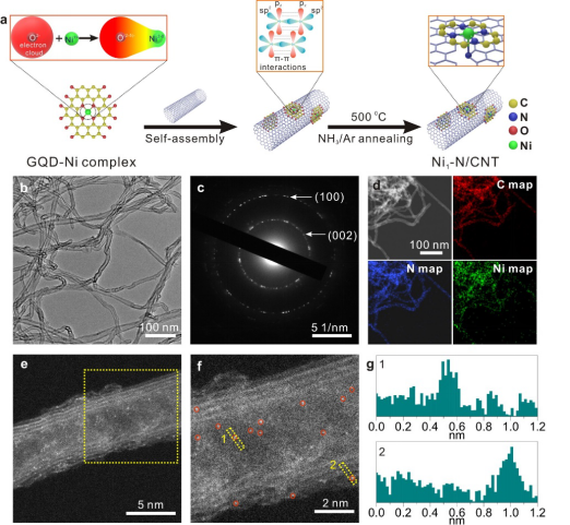 论文DOI:10.1002/anie.202008422在论文工作中,提出一种墨烯量子点束缚策略来合成单原子催化剂的新方法。实现了不同金属单原子如Cr、Mn、Fe、Co、Ni、Cu和Zn等在不同的碳基底如碳球(0D)、碳纳米管(1D)、石墨纳米片(2D)和石墨泡沫(3D)上的负载,其金属负载量可以达到3.0 wt%以上。制备的碳纳米管负载的单原子镍催化剂对二氧化碳电还原具有极高的催化活性(CO选择性接近100%)。该工作有望为合成用于多种电催化应用的单原子催化剂开辟新的途径。单原子催化剂具有100%的原子分散性、高度不饱和的配位环境和均匀的反应中心等特点,因而表现出很高的催化活性和选择性。碳基负载的单原子催化剂在电催化领域引起了广泛的关注,因为碳基质不仅可以作为稳定金属原子的基底材料,而且较强的界面相互作用会改变金属原子的电子密度, 从而提高电催化活性。然而,目前可控合成碳基负载单原子催化剂仍是一个科学难题,这主要是由于单个金属原子具有超高的表面能,易迁移团聚形成纳米颗粒。目前大多数碳基负载单原子催化剂是通过将碳源、氮源、金属前驱体直接混合后碳化,包括小分子(吡咯、海藻酸钠和多巴胺),聚合物(聚苯胺、聚酞菁),碳材料(氧化石墨烯、异质原子掺杂碳和C3N4)。另外一种常用的制备策略是利用金属有机框架材料(MOFs)的分子孔道封装和锚定单核金属前驱体,然后在高温退火条件下利用载体衍生的氮掺杂碳稳定形成的单原子,从而实现单原子催化剂的合成。但是,这些合成单原子催化剂的方法对于单原子和碳载体都有比较高的要求,还不能实现在多种碳基底上制备各种金属单原子催化剂,因此,发展一种对碳载体和金属无选择性的、普适性的单原子合成方法具有重要意义。具有空d轨道的金属阳离子与拥有孤电子对的配位原子如N、O和S之间有很强的配位作用。因此,构建有效的配位位点去锚定金属盐前驱体,同时捕获形成的金属单原子防止其迁移团聚是合成单原子催化剂的关键。氧化剥离的石墨烯量子点(GQD)具有丰富的含氧基团,同时大量暴露的边缘缺陷可以为氮原子的掺杂提供丰富的位点。此外,GQD的π共轭结构,允许GQD通过π-π相互作用牢固地锚定在各种碳载体上。因此,利用GQD束缚策略就可以实现不同单原子在不同碳载体上的负载。 ▲Figure 1. (a) Schematic illustration of the preparation of SACs. (b) SEM image, (c) SAED pattern, (d) EDX maps, and (e, f) HAADF-STEM images of the Ni1-N/CNT. (g) The height profile of Ni single atoms.