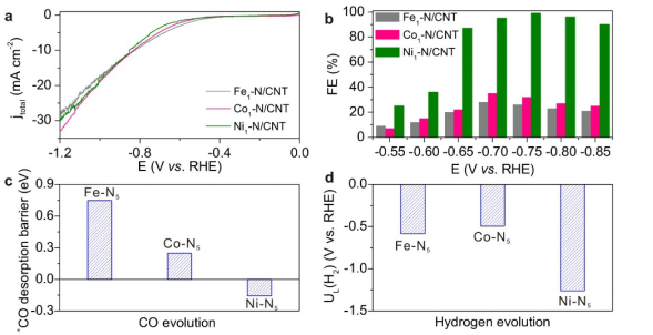 基于上述制备单原子催化剂的方法,我们实现了不同金属单原子如Cr、Mn、Fe、Co、Ni、Cu和Zn等在不同的碳基底如碳球(0D)、碳纳米管(1D)、石墨纳米片(2D)和石墨泡沫(3D)上的负载(图3)。球差电镜表征和X射线吸收精细结构(XAFS)表征确定了材料中的金属主要以单原子形式存在,且为M-N构型。该方法还可以拓展到其他非碳基底上如氮化硼,这些结果表明了该方法的通用性。▲Figure 4. (a) LSV curves of the M1-N/CNT catalysts. (b) FE of the M1-N/CNT. (c) The desorption barrier diagram for *CO. (d) The limiting potential diagram for HER.