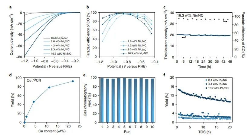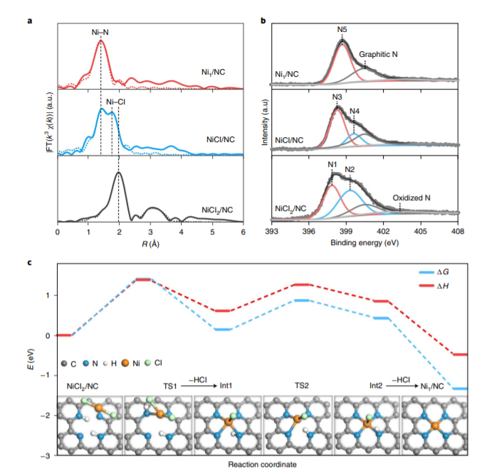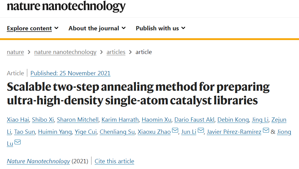 第一作者:Xiao Hai, Shibo Xi, Sharon Mitchell, Karim Harrath通讯作者:吕炯,Javier Pérez-Ramírez,李隽,赵晓续通讯单位:新加坡国立大学,苏黎世联邦理工学院,清华大学,南洋理工大学提高化学转化的原子经济性,确保稀缺催化材料的最大化利用,是可持续化学的中心目标。多相单原子催化剂(SACs)将单分散金属原子位点与可定制的配位环境相结合,在几种能量转换中显示出实现上述目标的巨大潜力。目前的根本挑战在于缺乏能够制备这些具有高表面密度催化剂的合成路线。其对于在大规模工艺中最大化单位反应器体积或面积的生产率尤为重要。在已报道的SACs的不同合成策略中,通过湿法沉积途径(如浸渍)合成后引入金属是最易于规模化的策略之一。这种方法也有利于表面定位,不同于直接合成方法,如大部分活性相可能嵌入大量载体材料中的热解法。然而,当引入高金属含量时,很难阻止金属物种的聚集成簇和纳米颗粒,特别是在采用常规热处理以从普通金属前体中去除抗衡离子之后。而通过避免金属盐沉淀或使用平衡吸附来避免这种情况的策略通常会限制沉积在载体上金属的量。目前尚没有相关报道通过后合成途径获得超高密度(UHD)催化剂(碳基催化剂中,金属含量超过10 wt%),或证明其在催化应用提高生产率的作用。另一个很少涉及的方面是扩展到多金属体系,这与技术催化剂的发展有关,多金属体系通常包含两种或多种金属,例如作为助催化剂、促进剂或稳定剂。除了选择具有丰富的金属原子表面锚定中心的载体外,人们关于其合成机理在分子水平上仍然知之甚少。近日,新加坡国立大学吕炯教授、瑞士苏黎世联邦理工大学Javier Pérez-Ramírez教授、清华大学李隽教授、新加坡南洋理工大学赵晓续报道了一种将浸渍和两步退火相结合的方法来合成UHD-SACs,实现了在不同化学性质的载体上,15 种金属的金属含量高达 23 wt%。1)自动化合成证明了其方法的可行性,并提供了一条探索几乎无限的单金属或多金属催化剂库的途径。2)在分子水平上,通过实验和模拟对合成机理进行了研究,结果表明,通过逐步去除配体来控制金属前驱体与载体的键合,可以防止金属前驱体在热诱导下聚集成纳米颗粒。3)随着金属含量的增加,反应性显著增强,因此需要针对特定的应用优化表面金属密度。此外,在三个不同的催化体系中观察到的与负载相关的特定位点的活性反映了多相催化剂设计的复杂性,而现在可通过一个具有广泛可调金属负载的单原子催化剂库来解决这一问题。研究人员利用常见金属前驱体(氯化物、硫酸盐或醋酸盐)的水溶液或用于多金属系统的混合物。两步退火法主要依赖于控制配体从金属前体的去除以及与载体的相关相互作用(图1d)。首先,为了调节配体去除,第一退火步骤(T1)的温度需要低于金属前驱体的分解温度。化学吸附的金属前驱体随后通过第二步高温退火(T2)转化为具有精准原子结构的UHD-SACs,并去除剩余的配体。通过两步退火法,成功在具有不同化学性质的载体(氮掺杂的碳(NC)、聚合氮化碳(PCN)和金属氧化物)上成功制备超过15种过渡金属的单金属或多金属UHD-SACs,具有通用性和扩扩展性。这种方法的优点在于有效地使表面充满金属,并通过选择性锚定机制保持较高的金属覆盖率,实现了最大限度地提高金属与所有可用的配位结合的可能性,并能够通过清洗去除未结合的物种,从而防止在随后的高温步骤中金属烧结,以去除残余配体,实现了比传统浸渍路线高得多的稳定的金属含量。电感耦合等离子体原子发射光谱(ICP-AES)分析表明,通过两步退火方法获得的NC和PCN载体上的金属含量均高于10% wt%,在一些情况下超过20% wt%(图1e)。研究人员利用环形暗场扫描透射电子显微镜(ADF-STEM,图2a)直接成像获得的UHD-SACs在NC上的原子金属分散性,揭示了其孤立原子密集分布的特征。EDS分析证实了金属分布均匀,且没有大团聚体。此外,高倍率ADF-STEM图像中的亮点(图2b)显示,NC、PCN和CeO2负载的Pt的直径约为0.2 nm粉末X射线衍射图证实在所有UHD-SACs样品中不含结晶金属化合物,所有UHD-SACs样品的傅立叶变换扩展X射线吸收精细结构(EXAFS)谱均在1.5°附近出现主峰,对应于M-N/O键长(图2c)。同时在任一样品中都没有观察到2.1和2.5 Å之间金属-金属配位的特征,这证实了样品中不存在金属纳米颗粒或团簇。此外,吸附在Pt1/Nc,Pt1/PCN和Pt1/CeO2上的CO的红外光谱始终只有一组CO吸收带,中心位于2117 cm−1(图2d)。在2070-2090 cm−1范围内没有观察到对应于Pt纳米颗粒的红外峰。这些结果进一步验证了原子分辨ADF-STEM分析,证明研究人员成功地制备了基于不同金属和载体的UHD-SACs。Ni和Pd以及Ni-Pd-Pt UHD-SACs的ADF-STEM图像也证实了金属的原子分散性(图3 a, b)。同时,能量色散X射线能谱得到的元素图也证实了Ni-Pd-Pt UHD-SACs中各元素的空间均匀分布(图3c)。在计算化学和催化剂表征和测试方面,催化研究正研究朝着自动化和标准化的方向不断发展,基于此,研究人员将两步退火方法转化为自动化合成方案。使用机器人平台(图4a)可以精确控制添加金属的数量和速度以及样品清洗的范围,并且只需要对基于实验室的准则进行少量的调整,例如在将载体与金属前驱体的水溶液混合时,使用振动代替超声波(图4b)。因此,该工序可以很容易地获得金属含量范围很广的Ni SACs(图4c)。与实验室方案相比,自动化制备的样品中观察到的数值略低。鉴