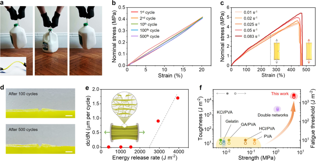 此外,通过循环拉伸试验中裂纹扩展的能量释放速率来评估的热电池的抗疲劳性。在几百个循环中,热电池没有观察到裂纹的扩展,其疲劳阈值约为2500 J m-2。它比此前最坚韧的双网络离子热电池预计高出了五倍,比单网热电池高几百倍。显著的抗疲劳性是因为具有高取向和部分结晶域的分层纤维作为强大的障碍,阻止裂纹扩展。与现有的准固态热电池比较,该热电池在强度、韧性和疲劳阈值方面均显示出几个数量级的提高。
