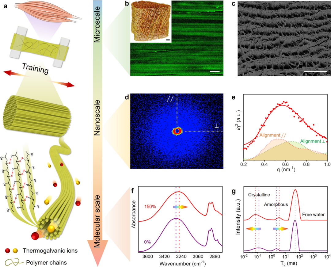 这项工作通过模拟天然肌肉中各向异性结构,开发了具有分层纤维和取向纳米通道的离子热电池。这一概念通过训练一种具有可重组物理交联网络的商业化聚合物得到了证明,并在不影响热电功率密度的情况下显著改善了准固态热电池的长期力学稳定性。其断裂伸长率、韧性和疲劳阈值分别达到了470%、17900 J m-2和2500 J m-2,甚至高于天然肌肉组织。与现有的具有无序聚合物网络的准固态热电池相比,离子导电性增加了约5倍,这是由于排列整齐的纳米通道为离子传输提供了高途径。这项工作取得的突破表明,通过设计能量收集和转换材料的分层结构,可以同时提高力学性能和输出功率,让离子热电池真正发挥出可持续可长期供电的优势。