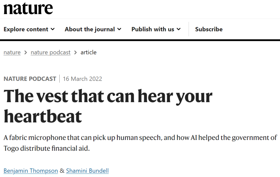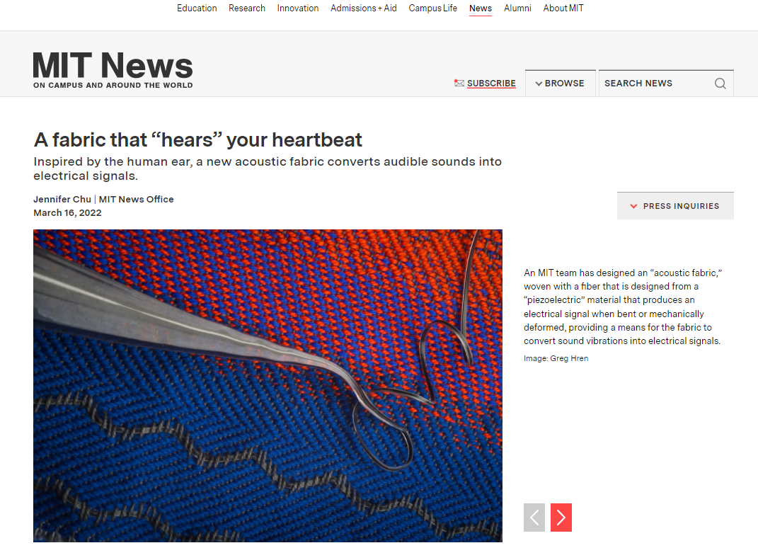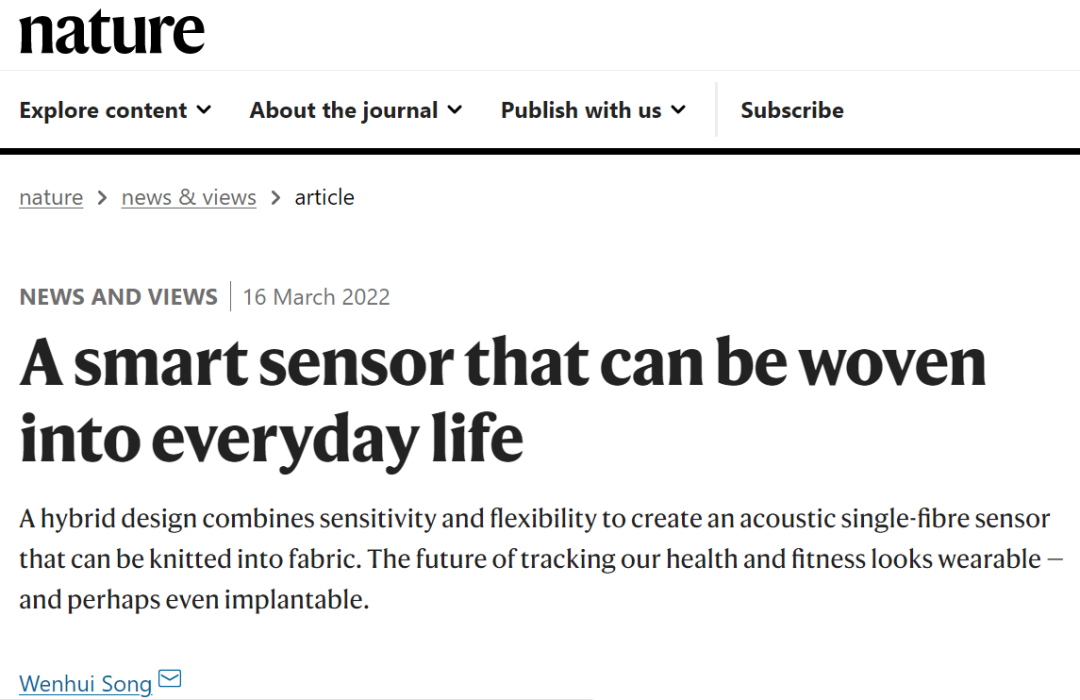 北京时间2022年3月16日,美国麻省理工学院的Yoel Fink教授团队(fibers@MIT)在Nature主刊报道了他们新开发的一款声学织物,其可像人的耳朵一样听见并记录微弱的声音。Yoel Fink教授为论文通讯作者,严威博士(现新加坡南洋理工大学电子与电气工程学院及材料科学与工程学院双聘助理教授)为论文第一作者。