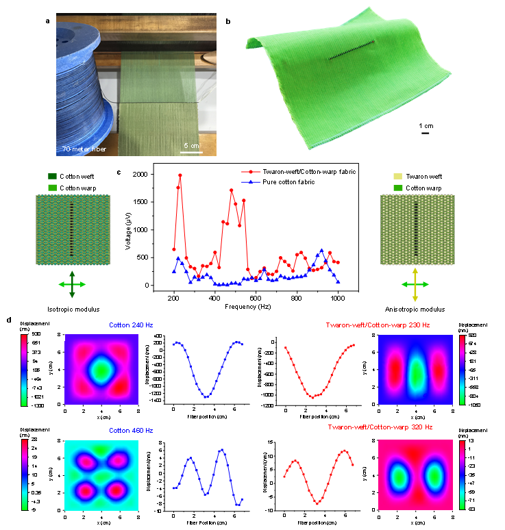 看到这些场景,您是不是已经感受到了声音及监测与记录声音的重要性?是不是也曾设想过能否通过我们身上穿的衣服就能无时无刻听音乐、跟人电话语音聊天,能在嘈杂的环境中定向地听到自己想听的声音,能随时随地像医生一样听诊我们的心脏?衣服正在由简单的棉、麻、绸等形态慢慢地转化为高度集成的电子器件、智能系统甚至计算平台。目前,衣服可以能量存储、光通信、热管理、显示、储存和处理数字信息,甚至有简单的计算等功能。这类全新的织物将传统纺织制造、信息通讯、人工智能、生命健康、脑科学、医疗机器人、空天科技等领域有机地串联起来,正在孕育新兴的学科方向与前沿技术,有望变革人们的生活方式。那么,织物是否可以作为一个有效的声音收集器来监测并处理微弱的可听信号(10-7大气压)?这类织物能否穿戴舒适、美观、透气防汗且耐受机洗?织物是由相互缠绕的纱线制成的分层结构,这些纱线由加捻的短纤维或长丝纤维相互扭转弯曲组成。因此,这种层级结构具有非常庞大而复杂的界面,这些界面散射并消散传播的声子,将声音的震动耗散为热能。几千年以来,织物一直被用作高效的声音吸收器。在自然界中,纤维常常起到传递声音的作用,而不是耗散声音。例如,在人类的听觉系统中(图1a),鼓膜负责解决耳道中的空气和内耳中的液体之间的声学阻抗不匹配,它恰好是由周向和径向的高模量纤维构成。鼓膜先将声压转变成中耳骨的机械振动,然后这种振动被传送到内耳的耳蜗。在耳蜗中,纤维状的毛束发生偏转,最终将机械振动转化为电信号(离子),由神经系统接收。受启发于听觉系统将声压转化为机械振动,再将机械振动转化为电信号这样一种有序的传导机制,以及纤维在听觉系统中的重要性,团队设计了这款全新的声学织物。与听觉系统复杂的三维结构不同,这款织物是平面状的,其由织物基体与编织进去的纤维传感器组成。织物基体由高模量纱线与棉线构造,其可像鼓膜一样高效地将声压转化为机械振动。纤维传感器然后像耳蜗一样将机械振动转化为电信号。构建了耦合声场、压力场与电场的有限元模型来指导纤维结构设计。研究发现,纤维“内硬外软”可以高效地将机械振动产生的形变能集中分布在纤芯;纤维的非对称结构可以让纤维在形变时产生更大的应变。采用基于光纤生产的热拉技术,一步大批量地制备由六种材料组成的纤维,这六种材料包括P(VDF-TrFE)与压电钛酸钡(BaTiO3)陶瓷颗粒复合形成的纤芯,纳米碳粉与聚乙烯复合形成的电极,Cu丝电极以及SEBS弹性体。热拉技术可以将具有不同的电、光、声、热和机械性能的材料甚至微纳芯片一步集成到单根纤维中,所制备的纤维具有极其精致的宏观微观结构和复杂多样的功能。热拉诱导了P(VDF-TrFE)/铁电钛酸钡(BaTiO3)铁电驻极体的形成。测得压电电荷系数 d31 高达约 46 pC N-1,显著高于热拉的 P(VDF-TrFE) 纤维(约 20 pC N-1)和热压 P(VDF-TrFE)/BaTiO3 复合材料(约 10 pC N-1),以及优于现有的 PVDF 基压电材料。纤维可以承受复杂的弯曲和扭曲等变形。其电容在 3,000 次弯曲或扭曲循环变形后稳定不变。十次机洗测试进一步证实其高可靠性和机械顺从性。为了探究如何设计声学织物以及声学织物的工作机制。首先研究简单的纤维/薄膜模型。研究发现:1)最小的声音探测能力是0.002Pa(40分贝,相当于安静的图书馆的声压)。纤维的灵敏度为19.6 mV,这与商业化的电容式和动圈式麦克风相当。高灵敏度使其能够有效地检测到可听声音,如人说话、吹气、树叶沙沙声和鸟叫声。2)对不同频率的声音的响应是不一样的。在共振频率测得的振动模态为低阶,其使得纤维只向一个方向发生弯曲,因此,相同类型的电荷(无论是正还是负)会在同一电极上叠加,从而输出高电压;在反共振频率测得的振动模态为高阶,纤维会向不同方向弯曲变形,因此,不同类型的电荷会在同一电极上相互抵消,从而输出低电压。3)相对于高阶振动,低阶振动诱导纤维产生更大的振动振幅,从而产生更大的形变而输出高电压。4)在声波的作用下,模量高的薄膜更容易输出低阶振动。为了制备高灵敏的声学织物,需要获得低阶振动。因此,设计了经线由棉线组成和纬线由高模量的Twaron长丝组成的织物,同时设计了径线与纬线都由棉线组成的参比织物。两种织物都由织布机编织,热拉纤维直接编织集成到织物基体中。两种织物具有相同的厚度、重量和尺寸,但在模量与使用长丝和短纤维方面有所不同。研究发现:1)高模量的Twaron/棉织物的声学响应要远远高于纯棉的织物;2)Twaron/棉织物显示出各向异性振动波长(纬向波长较长,经向波长较短)。纯棉织物具有各向同性振动波长(纬向和经向波长相同);3)织物与纤维的振动幅度极其微小,在纳米级别;4)在相同声音频率下,Twaron/棉织物具有低阶机械振动模态,其诱导纤维产生更高的振动幅度,同时诱导纤维只向一个方向发生弯曲变形。相反,纯棉织物具有高阶振动模态,纤维中产生明显的电荷抵消效应。一块典型的声学织物仅包含约 6.7 厘米的纤维,约占织物体积的 0.1%。一次热拉可以制备40m 纤维,用这个长度可以生产近50 平方米的声学织物。十次机洗循环后,织物依旧保持其电学特性和声学特性。