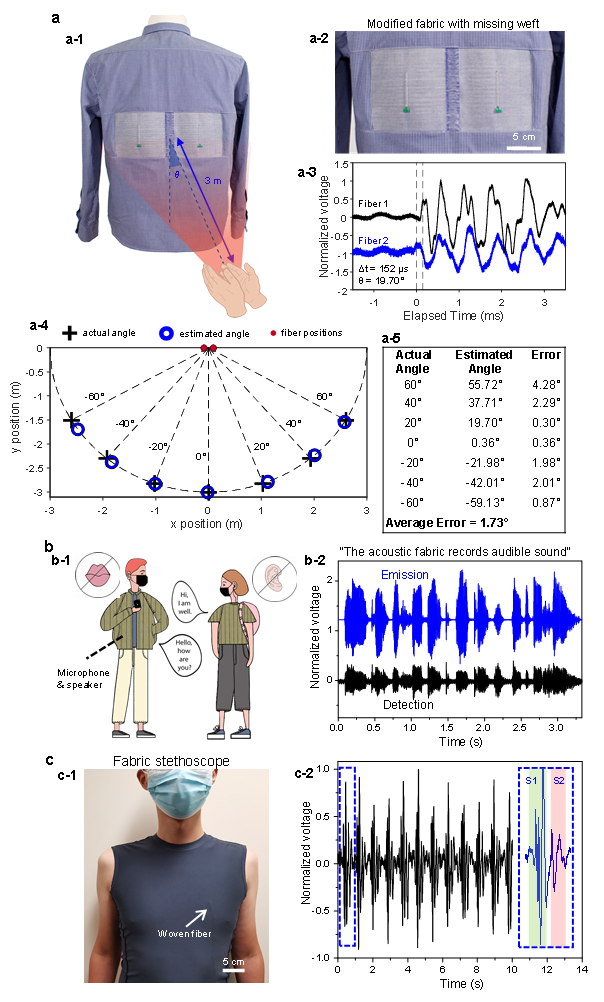 本项工作阐述了新一代声学织物的设计原理、材料、制备方法和其工作机制。该全新的织物能够高效地监听可听声音,其性能与商业麦克风相当。在声源方向监测、声学通信和心脏听诊方面的应用论证了这项技术在更多领域的广泛适用性,这些领域包括计算织物、医疗健康、安全、航空航天工程、通信、生物医学和机器人等。