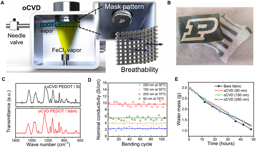图1.oCVD PEDOT 的表征:(A) oCVD 工艺示意图;(B)织物上图案化的 oCVD PEDOT;(C) FTIR 光谱;(D) 导电性与抗弯曲性测试;(E) 透气性测试。