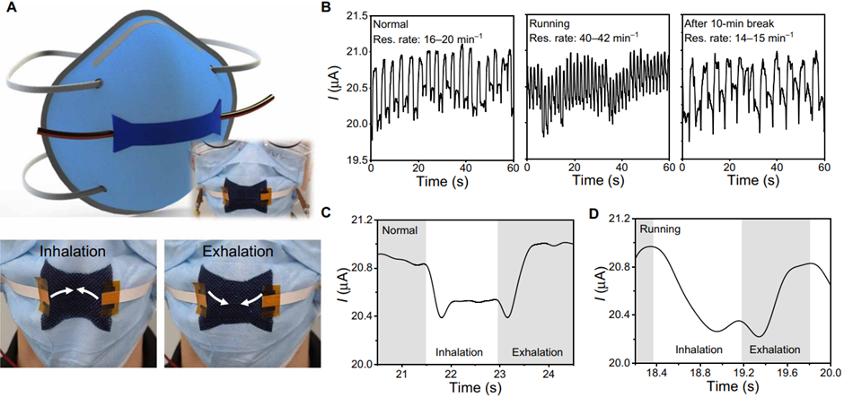 图4. 在口罩上制作的oCVD PEDOT呼吸频率传感器。(A) 传感器的示意图与实物图;(B-D) 传感器对不同人体状态下(正常、运动、休息)的呼吸监测图。