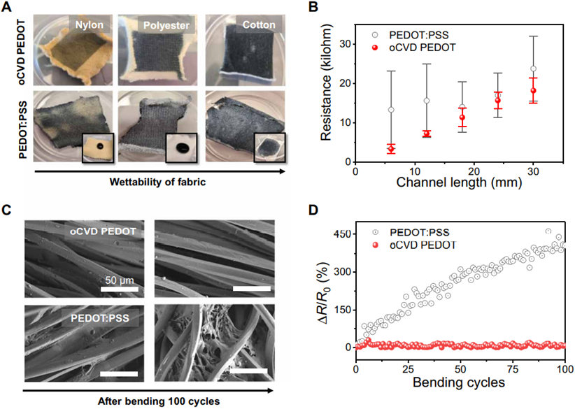 图2.oCVD PEDOT 与基于溶液沉积的 PEDOT: PSS 之间的比较:(A) 两种涂层包覆的织物图像;(B)两种涂层的电阻差异;(C) 涂敷在聚酯基底上的两种涂层在经历100 次弯曲后的 SEM 图像;(D) 两种涂层在弯曲测试试验期间的电阻变化。