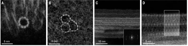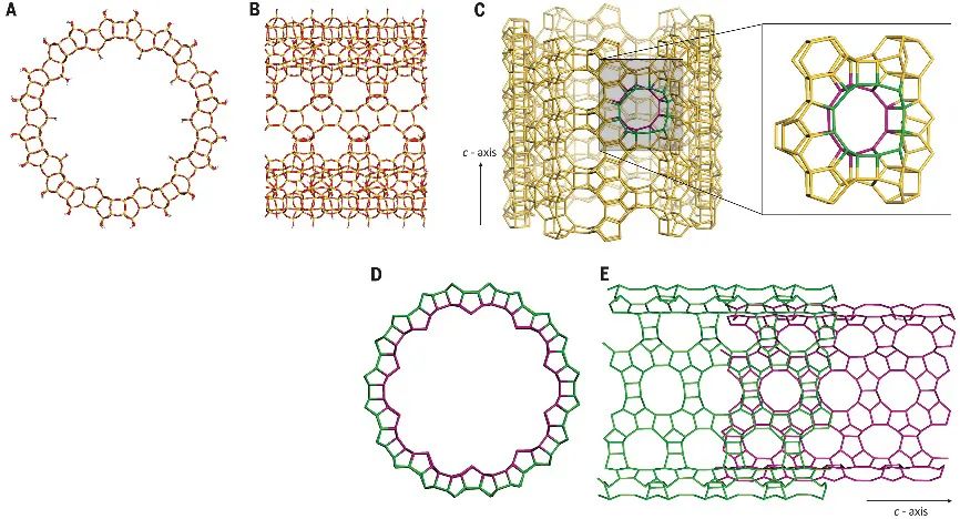 沸石纳米管的横纵切面结构。图片来源:Science研究者分别对具有6、8、10、12和14个重复结构单元的纳米管进行模拟计算,发现10个重复单元的表面能最低,其管径、介孔及微孔尺寸与实验数据也完全吻合。