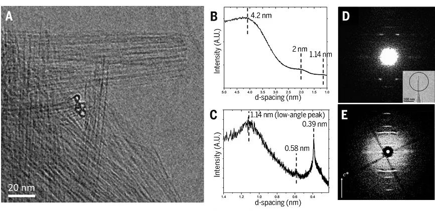 软模板法合成沸石纳米管示意图。图片来源:Science [4]近几年,结构导向剂作为软模版用于沸石合成,成功制备了多种类型的沸石二维纳米片(MFI、MWW、FAU、AEL等等)。研究者借鉴该制备方法,设计了一种双季铵盐表面活性剂作为结构导向剂(BCPh10Qui)。设计思路是:中心的联苯结构有利于导向剂分子之间的π-π堆积并形成胶束,诱导沸石纳米管的自组装;两端的亲水性大位阻季铵基团引导沸石生长;季铵基团和联苯中心由足够长且有柔性的烷基链连接,一方面疏水性烷基链抑制沸石在三维方向上结晶,另外还有利于引导沸石的生长从层状 (2D) 材料转变为管状 (1D) 材料,由此形成圆柱形沸石壁。