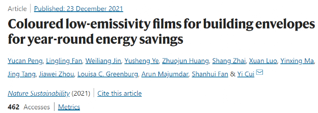 斯坦福大学崔屹团队Nature Sustainability:用于建筑全年节能的彩色低发射率薄膜