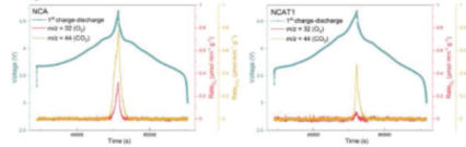 O2 and CO2 evolution rates during in-situ DEMS measurements and the corresponding voltage profiles of NCA and NCAT1 cycled at 0.1C between 3.0 and 4.7 V
