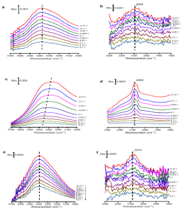 In-situ ATR-SEIRAS spectra recorded during stepping the potential from 0.2 to −0.15 V vs. RHE in H2-saturated 0.1 M KOH electrolyte for a-b Ru/C, c-d Ru7Ni3/C and e-f Acid-Ru7Ni3/C.