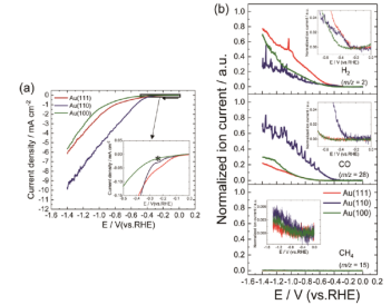 (a) Polarization curves of Au(hkl) recorded in a CO2-saturated 0.1 M KHCO3 solution at 1 mV/s. (b) Normalized Q-mass ion currents for hydrogen, carbon monoxide, and methane detected by OLEMS with dependence of the applied cathodic potential. Insets are magnififications of the onset potential regions.