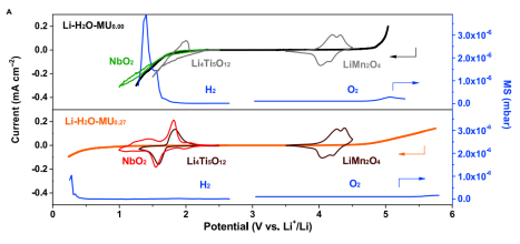 In situ ATR-FTIR spectra of the NbO2 electrode surface during the initial two charge-discharge cycles of the NbO2|LiMn2O4 full cell. The SEI formation on the NbO2 electrode starts in the charging at 2.0 V; both TFSI and MU contribute to the SEI formation.