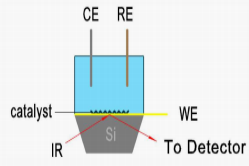 原位电化学红外技术是将电化学反应池接入红外光谱仪样品仓中,在进行电化学反应的同时,实时采集反应过程中的红外光谱信号,实现原位检测固体电极上的吸附态物种,从而实现: