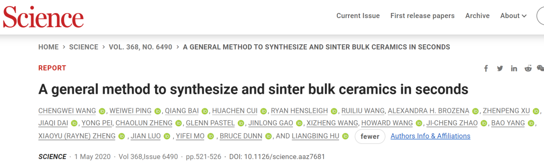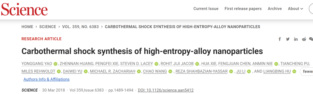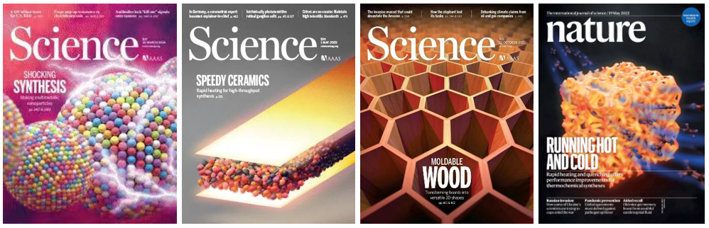 高产,四年连发9篇《Nature》 、 《Science》正刊,其中3篇《Science》封面、1篇《Nature》封面,这令人瞠目结舌的发文速度,还有各种Nature和Science大子刊,发着跟玩似的!这是哪个课题组?马里兰大学的胡良兵教授!接下来让我们简单梳理一下胡良兵教授的成果。热化学反应沿着受反应温度和时间严重影响的特定途径进行。特别是,根据阿伦尼乌斯定律,基本反应速率与温度呈指数关系,并且通过建立或移动化学平衡可以进一步影响产物分布。因此,加热曲线的动态调节可用于控制反应路径以实现目标产物的收率和选择性。然而,由于缺乏对反应温度和时间以及反应路径的时间控制,在近平衡条件下通过连续加热进行常规热化学合成在提高合成速率、选择性、催化剂稳定性和能源效率方面面临严峻挑战。鉴于此,胡良兵教授课题组提出了一种非平衡、连续合成技术,该技术使用脉冲加热和淬火(例如,0.02秒开,1.08秒关),使用可编程电流快速切换高温(例如,高达2400 K)和低温。快速淬火确保了高选择性和良好的催化剂稳定性,同时降低了平均温度以降低能源成本。使用CH4热解作为模型反应,本文的可编程加热和淬火技术导致对增值C2产品的高选择性(>75%,与传统非催化方法的<35%相比,与使用优化的大多数传统方法相比<60%催化剂)。该技术可以扩展到一系列热化学反应,例如NH3合成,为此作者在环境压力下使用非优化催化剂实现了约6000 μmol gFe-1 h-1的>100 h高稳定合成速率。本研究为高效非平衡热化学合成建立了新模型。胡良兵教授,从2018年他与马里兰大学李腾教授合作开发出强度媲美钢材的超强致密木材,成果发表在《Nature》后,一直被称为“木头大王”!该工作一经发表就引起全世界范围广泛的关注和媒体报道,刮起了一阵“超级木头”的旋风!2019年,胡良兵教授课题组还通过木材完全脱木素、致密化工艺,研制出机械强度慰404.3兆帕结构材料,是天然木材8倍以上,成功研制出辐射制冷木头,相关成果发表在《Science》上。2021年,胡良兵课题组报告了一种利用细胞壁工程将硬木平板塑造成多功能3D结构的加工策略,由此产生的3D模制木材,强度是原始木材的六倍,与广泛使用的轻质材料铝合金相当。这种方法大大拓宽了木材作为结构材料的潜力,有望对建筑和交通等领域应用产生巨大影响。相关研究论文以封面文章的形式发表在Science上。2021年,胡良兵课题组报告了通过分子通道工程实现高性能固态聚合物离子导体的一般策略,成功将“木头”变成固态电解质。通过铜离子(Cu2+)与一维纤维素纳米纤维配位,改变了纤维素的晶体结构,结果聚合物链之间的间距被扩大为可供Li+嵌入和快速传输的分子通道,从而实现了Li+沿着聚合物链的快速传输。相关成果发表在《Nature》上。实际上,除了玩转木头,胡良兵教授在“高熵合金”、“固态电解质”等等领域成果颇丰。其中不得不提“热冲击合成技术”(TSS技术)。热冲击合成(TSS)是一种通过快速高温加热合成材料的方法。在TSS过程中,施加高达3000K的温度,持续时间仅为几秒或几毫秒,然后快速冷却。在这方面,TSS与传统的高温合成不同,传统的高温合成具有在有限的温度范围(例如1500K用于炉子加热)长时间(通常是小时),通常缓慢加热和冷却(~10K/min)。TSS利用高温来驱动极端和非平衡条件下的反应。此外,使用超高温可以显着提高快速材料生产的反应速率。由于这些特性,TSS特别适用于发现新反应和材料并实现快速制造。胡良兵团队发明的该技术还获得了专利。TSS最初是通过焦耳加热碳材料至高温并在短时间内快速淬火实现的,由具有高时间分辨率的电力控制。TSS的本质是能够精确控制高温以确保快速“冲击”加热。通常,温度、持续时间和升温速率可以针对特定的加热要求独立控制。由于高温加热普遍用于反应和材料合成,创新的TSS工艺已被发现并得到证实,包括微波、激光、快速辐射加热和放电闪蒸加热,能够合成多种新兴材料,例如单原子和合金催化剂、高熵合金纳米粒子、纳米级复合材料、电池正极和负极以及高质量石墨烯等。热冲击技术可能会让制造商成为制造产品的新方式。胡良兵教授团队通过TSS技术及其创新的技术制备了大量性能优异的材料。该团队之前曾应用全新的两步碳热冲击法制备得到高熵合金纳米颗粒,运用循环震荡加热的方法合成了高分散、热稳定的单原子催化剂,利用超快高温烧结工艺制备结构致密、性能优良的陶瓷材料。