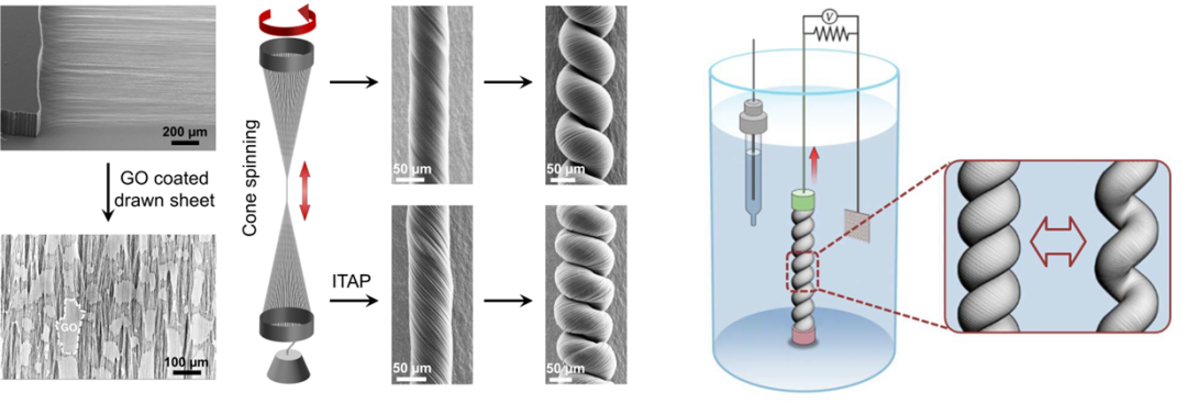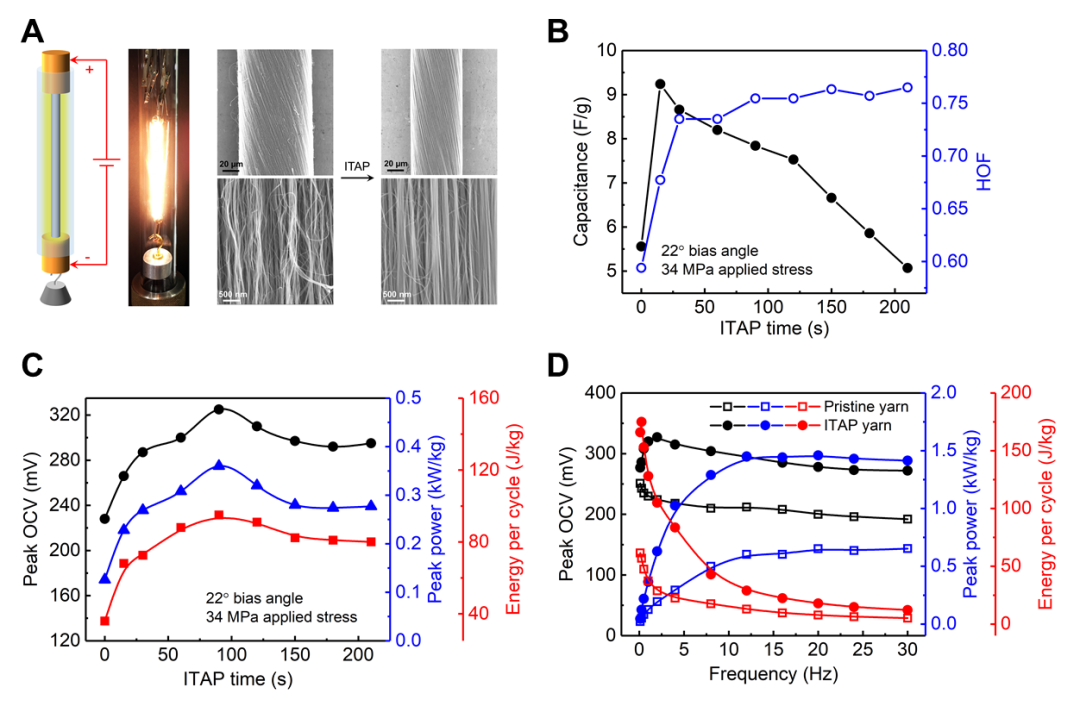 研究人员介绍,“这些方法包括优化碳纳米管前体阵列的排列取向、塑性拉伸前体加捻纱线、在预卷绕加捻期间施加比卷绕加捻时更高的拉伸应力、在应力下进行电热脉冲退火、以及包裹还原氧化石墨烯纳米片。” 通过这一系列改进方法,该团队使 Twistron 发电纱线的机械能收集能力获得极大提升。