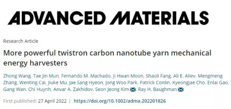 相关论文以《更强大的 Twistron 碳纳米管发电纱线》(More powerful twistron carbon nanotube yarn mechanical energy harvesters)为题发表在 Advanced Materials上,美国德克萨斯大学达拉斯分校纳米技术研究所王重副研究员为第一作者,雷伊鲍曼(Ray H. Baughman)教授担任通讯作者 [1]。