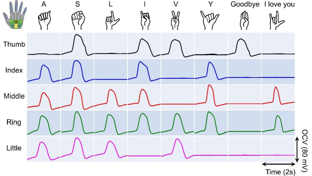 同时,Twistron 发电纱线还可用做自供电应变传感器。王重表示,当将 Twistron 纱线编织入智能手套时,根据输出电压可以很容易地对不同手部动作的变化进行手语识别,这表明其具有作为自给电手语传感器的潜力。