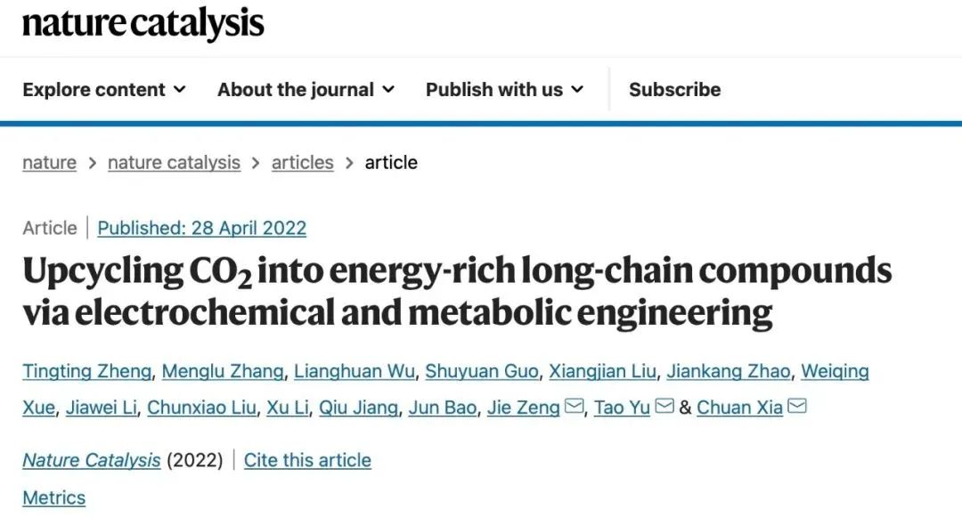 既从二氧化碳到淀粉人工合成研究取得原创性突破后,日前,我国科学家通过电催化结合生物合成的方式,将二氧化碳高效还原合成高浓度乙酸,进一步利用微生物可以合成葡萄糖和油脂。这一成果由电子科技大学夏川课题组、中国科学院深圳先进技术研究院于涛课题组与中国科学技术大学曾杰课题组共同完成。相关论文以封面文章形式发表于 Nature Catalysis 上。