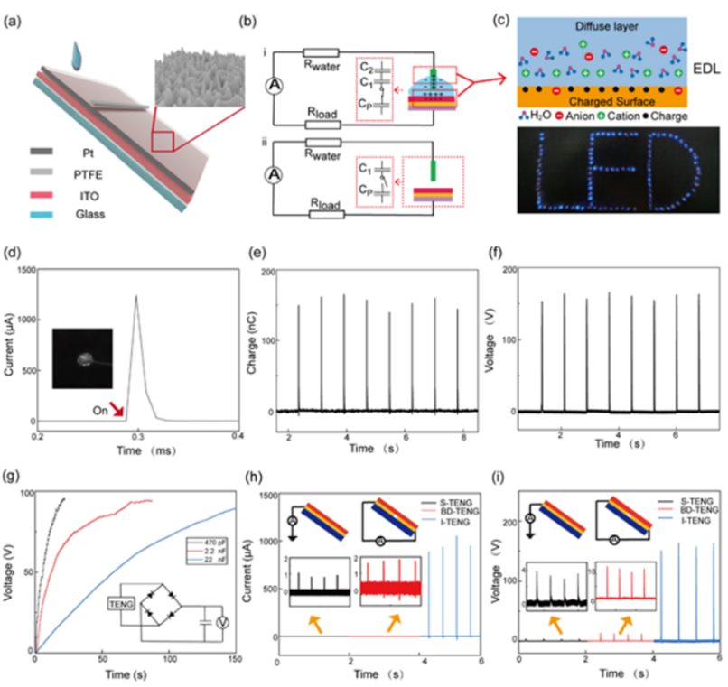作者开发了一种由仿生表面结构和瞬时开关结构设计组成的瞬时摩擦纳米发电机(I-TENG),可将先前TENG器件的输出提高10倍以上。该I-TENG以Pt线作为顶部电极,氧化铟锡作为底部电极,聚四氟乙烯(PTFE)作为摩擦层,并在PTFE表面上通过等离子体刻蚀产生带有微/纳米柱状突起的仿生结构。这些仿生结构赋予了器件的超疏水性能,能增加表面电荷密度和减少界面液体残留。I-TENG的电压、电流、转移电荷和能量转换效率分别为150 V、1.25 mA、150 nC和24.89%,远高于之前的报道。此外,作者提出了一种定量方法,称为动能计算和电流积分方法(KECCI),用于表征能量转换流、液滴下落速度、输入机械能/动能、摩擦压力。根据该方法可得到摩擦表面上存在的有效压力和液滴落到表面上的最佳高度,以促进对TENG系统中能量流的理解,并指导此类系统的多层结构设计的开发。