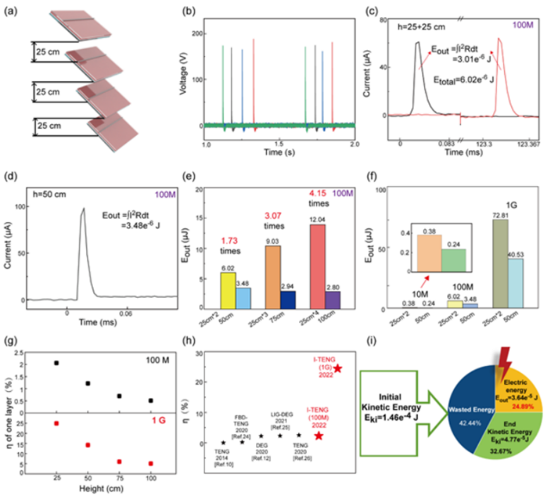 当雨滴从高空落下时,只有一小部分势能转化为动能,且只有一小部分动能转化为电能。为了缓解这个问题,作者提出了一种多层结构,该结构允许中间阶梯式集水过程。其中水最初由装置的最顶层收集,然后滴落到额外的I-TENG层上,极大地提高了总能量产生和能量转换效率。作者计算了不同层数的I-TENG在50、75和100 cm高度下的电能输出。当液滴从75 cm落下时,三层I-TENG的输出能量是单层器件的3.07倍;当液滴从100 cm的高度落下时,四层器件的输出能量是单层器件的4.15倍。最后,根据KECCI方法,整个能量转换过程以动能输入能量开始,以电能输出能量结束。因此,该定量分析方法能够为输入和输出能量的量化提供一个标准。