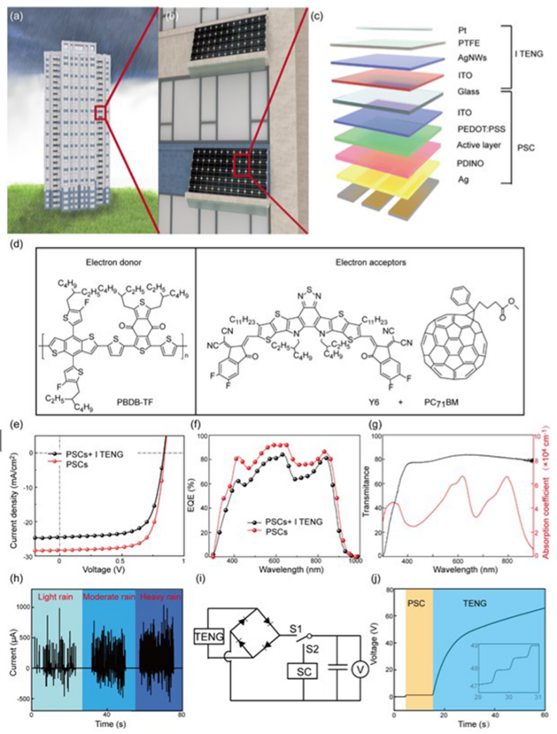 作者设计了一个由聚合物太阳能电池(PSC)和I-TENG组成的多层混合能量收集系统来实现全天候能量收集。其中混合装置的顶部是包含透明PTFE薄膜的I-TENG,而底部是PSC。在太阳光下,该混合系统展现出了14.4%的高功率转换效率。此外,该混合系统在不同降雨强度下产生了大致相同的输出电流幅度,而在较高的降雨强度下电流密度明显更高。这说明该设备在大雨和小雨条件下都具有良好的性能。该混合能量收集系统弥补了太阳能电池在阴雨天气中的部分损失,从而展示了全天候能量收集的优势。在晴天,混合能量收集系统会快速将电容器充电至3 V。如果天气变化,开始下雨,电容器将从3 V充到65 V。这种高性能的混合能量收集系统为从多种自然资源中收集能量提供了新的策略,从而推动了TENG技术的产业化。