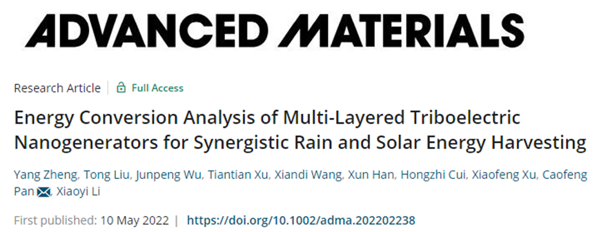 中国海洋大学李潇逸、徐晓峰/纳米能源所潘曹峰《AM》:用于雨水和太阳能协同收集的多层摩擦纳米发电机!