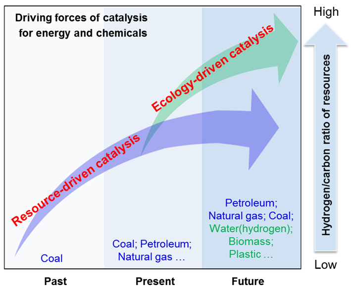催化科学与技术的发展史表明,催化可以为资源、环境等问题提供重要解决方案。百余年来,面向能源与化学品的催化发展主要是由石油、煤等化石原料转化驱动,可称之为原料驱动的催化;未来,除了化石原料的高效催化转化,还将以阳光、水、二氧化碳来生产满足经济社会需要的能源和物质,可称之为生态驱动的催化。随着人类社会从工业文明逐步迈向低碳时代,能源与化学品催化的动力正呈现由原料驱动向生态驱动发展的必然。