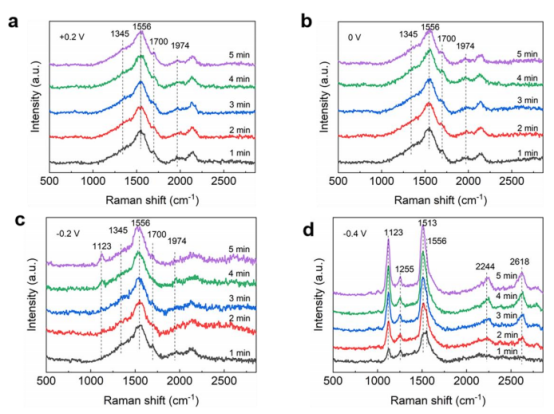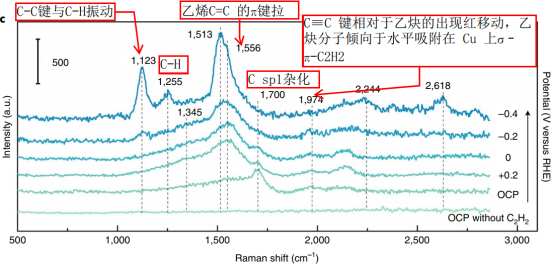 在电化学研究中,电化学拉曼光谱已经成为探究反应界面常用的技术方案之一。在该研究中,研究人员利用原位拉曼光谱观测了不同电位、时间下的拉曼伸缩振动峰(图三、四),首先是做了空白对照,在开路电位(OCP)未通入乙炔,没有明显的振动峰。随着乙炔气流的通入,出现了明显的ν(C ≡ C)振动峰(1700 cm-1)以及σ–π-C2H2 构造信号峰(1974 cm-1),这表明通入的乙炔气体吸附在铜树突的表面,而σ–π-C2H2峰的出现则说明乙炔是水平结合在铜树突表面。随着从OCP到+0.2V的电位的增加,乙炔的特征拉曼峰逐渐减小,生成了C = C拉伸峰(1556 cm-1)和对称的-CH2振动模式(1345 cm-1),说明乙炔在铜树突电极上逐渐反应,C ≡ C断裂生成了吸附型的*C = C中间体。进一步随着电势逐渐负移(0 – -0.4 V),出现了水平对置C = C 振动峰(1,513 cm-1),则表明生成了乙烯。电化学还原后拉曼光谱中还出现了C – H振动峰(1255 cm-1)、C – H与C – C振动重叠峰(1123 cm-1、2244cm–1)以及C = C振动峰与C – H混合峰 (2618 cm–1)。此外,并没有观测到C – C的振动峰说明没有过度加氢产物生成(乙烷)。