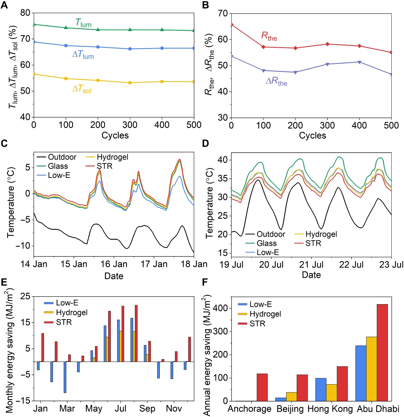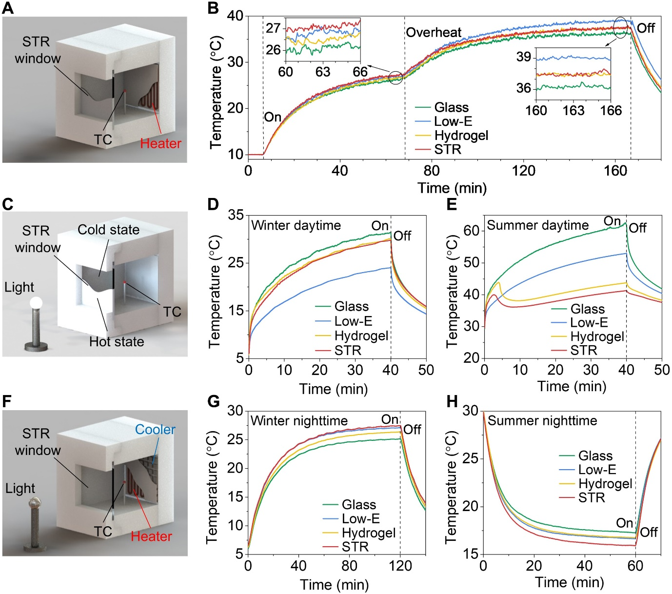 近日,香港科技大学黄宝陵教授、姚舒怀教授和香港城市大学李威宏教授(共同通讯)联合在国际著名期刊Science Advances上发表文章,题为“All-weather thermochromic windows for synchronous solar and thermal radiation regulation”。第一作者为香港科技大学博士后研究员林崇佳,共同一作为硕士生Jun Hur。研究团队首次利用水凝胶(pNIPAm)的热致水捕获和释放特性,利用水分子作为远红外热辐射调节剂,水凝胶为太阳辐射调控材料,并结合银纳米线的热反射性能,获得了拥有58.4%太阳辐射调控和57.1%远红外热辐射调控能力的热致变色智能窗(STR窗户)。此STR窗户在寒冷环境下,可透过大量的太阳光能,提高室内温度,同时反射大部分室内热辐射,防止热能外泄,达到突出的取暖保暖效果;在炎热环境下,可反射大部分太阳光能,降低室内的热荷载,同时吸收室内的热辐射并发射至室外,促进室内散热,达到优异的降温效果。室温测试和模拟计算均表明,此新型智能窗户相比于现有的节能窗户,其超宽光谱的自动调节能力,使其拥有更强的气候适用性,可于不同地区均实现显著的节能效益。