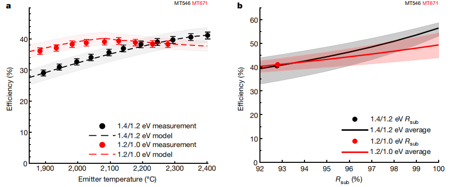 图3 热光电TPV效率;a.在1900°C到2400°C的不同发射极温度下测量的TPV效率,误差条表示效率测量的不确定度。虚线表示模型预测,阴影区域表示模型预测中的不确定性;b. 假设W型发射极AR = 1和VF = 1,且电池温度为25℃,将1.4/1.2 eV和1.2/1.0 eV串联器的预测效率作为加权子带隙反射率(Rsub)进行外推;实线表示在1900℃到2400℃的TEGS工作温度范围内的平均效率,阴影带表示在温度范围内的最高和最低效率;图2a中,点表示基于实测反射率的Rsub的现值,加权W AR = 1, VF = 1谱 © 2022 Springer Nature