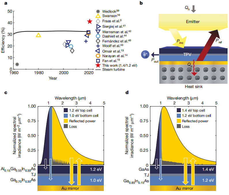 图1 串联热光电. a,不同电池材料的TPV效率:Ge(深灰色),Si(黄色),GaSb3(浅灰色),InGaAs(深蓝色),InGaAsSb(浅蓝色)和GaAs(橙色)。黑线显示了美国使用蒸汽涡轮机(煤和核能)发电的平均热效率。在2000年之前,涡轮效率还包括天然气;b. 入射在TPVs上的能量(Pinc)可以转换为电能(Pout),反射回发射极(Pref)或由于电池和背面反射器(Qc)的低效而热化。c.d 1.2/1.0 eV (c)和1.4/1.2 eV (d)的串联组,在平均发射极温度(2150 ℃黑体辐射)下的代表性光谱形状,表明光谱波段可以通过TPV电池的顶部和底部结转换为电能 © 2022 Springer Nature