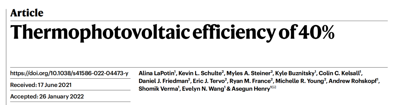 热光伏技术(TPV)可以通过光伏效应将红外波长的光转换为电能,并且能实现能量存储和转换。其中,所使用的高温热源比当今电力生产中普遍使用的涡轮机温度还要高。在其首次报道中,在2000℃下,采用集成的背表面反射器和钨发射器,实现了29%的效率,随后,其制造和性能进一步得以改善。然而,尽管预测的效率可以超过50%,但在远低于1300℃的低温下,其实际的效率仍然只有32%。如何提高热光伏效率一直充满挑战,但又是比较迫切的任务。