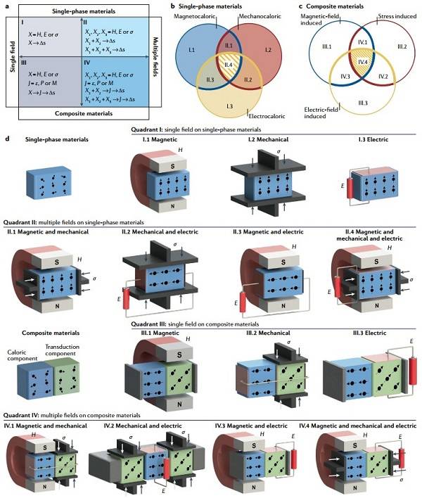 (b-c)针对单相材料和复合相材料的磁热、电热和力热效应,细分单场致效应和多场致效应之间的关系。