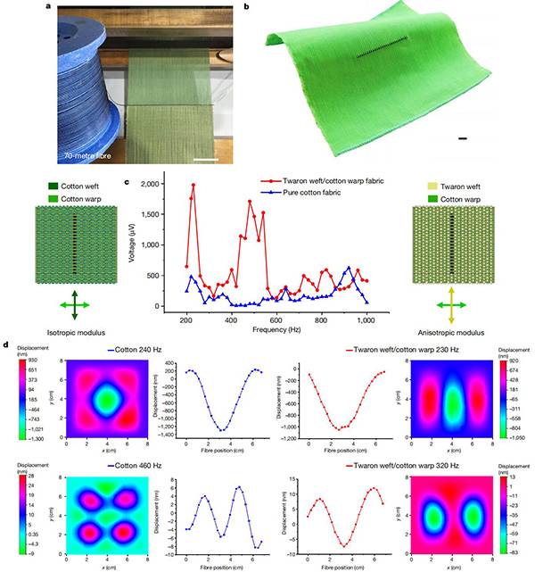 今日,麻省理工学院Yoel Fink教授(通讯作者)等人受听觉系统的启发,介绍了一种可用作灵敏的类似人类耳朵的织物,同时保留织物的传统特质,例如可机洗性和悬垂性。其中,织物介质由棉纱中的高杨氏模量纺织纱组成,将可听频率下10-7大气压力波转换为低阶机械振动模式。同时,将热拉伸复合压电纤维织入织物,与织物相吻合,并将机械振动转换为电信号。更加重要的一点是,光纤灵敏度的弹性包层,它将机械应力集中在压电复合材料层中,该层具有大约46皮库仑/牛顿的高压电电荷系数,这是热拉伸过程的结果。响应激励的电输出和空间振动模式的同时测量表明,具有纳米振幅位移的织物振动模式是纤维电输出的来源。纤维占织物体积的0.1%以下,单根光纤拉线可实现数十平方米的织物麦克风。三种不同的应用证明了这项研究的有用性:具有双声学纤维的机织衬衫测量声脉冲的精确方向,在用作声音发射器和接收器的两种织物之间建立双向通信,以及听诊心脏声音信号的衬衫。