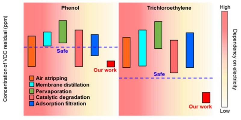 由于过度消耗和严重污染,安全淡水资源持续萎缩,加剧了全球水资源短缺。水净化技术的发展构成了一个不断扩大的潜在水资源清单,包括受污染的淡水源、海水、地下水和废水。目前,常用的多级过滤、反渗透和蒸馏等策略都是能源密集型的。其中,太阳能水蒸馏正在成为一种很有前途的方法,可用于水循环利用,特别是对于迫切需要分散水处理的地区。太阳能蒸馏通过从含有非挥发性污染物的原水中产生蒸汽来生产高质量的水,甚至可以满足饮用水的标准。但是,缺乏去除水溶性挥发性有机化合物(volatile organic compounds, VOCs)的能力,从根本上削弱了其实用性。来源于生活、工业和农业废水的挥发性有机化合物(VOCs)在低浓度下可能对人体健康有害。水溶性VOCs已经侵入自然界水循环系统,成为全球健康威胁。开发有效的技术来消除水中的VOCs对于确保饮用水的清洁和安全至关重要。膜蒸馏和渗透蒸发技术可用于VOCs/水分离,其中设计选择性渗透分离膜来实现水和VOCs分子在其中的不同迁移通量至关重要。然而,由于功能膜对低浓度水和VOCs的选择性不足,在高能效要求下生产饮用水仍然具有挑战性。