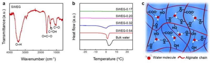 (b)DSC曲线追踪纯冰和完全水合SWEG的熔化行为,其中直线表明样品中的所有水分子通过氢键与HPN强烈相互作用,成为不可冷冻水;