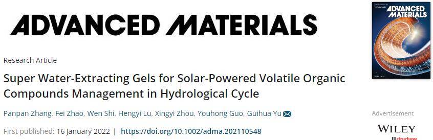 文献链接:Super Water-Extracting Gels for Solar-Powered Volatile Organic Compounds Management in Hydrological Cycle. Advanced Materials, 2022, DOI: 10.1002/adma.202110548.