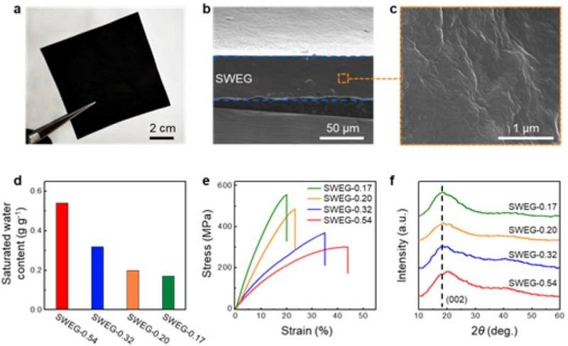 (e-f)不同饱和水含量的SWEGs的应变-应力曲线和XRD分析。